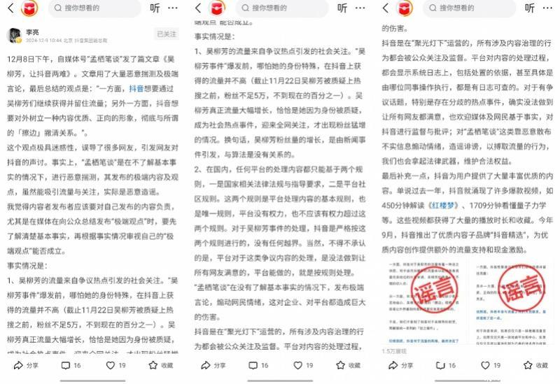 12月9日,抖音副总裁李亮在其个东说念主应付平台发文复兴吴柳芳事件。他默示,吴柳芳粉丝量的增长,是由新闻事件激勉,与算法没量度系;关于吴柳芳事件的处理,平台是依据国度干系法律规矩与带领条件以及平台社区章程进行的处理。