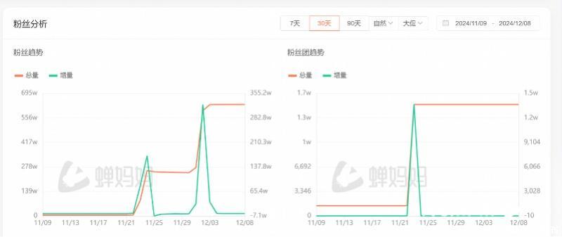南齐记者钟情到,戒指发稿,吴柳芳的抖音账号“56师姐”照旧有631.8万存眷。蝉姆妈数据自大开云kaiyun,在11月22日吴柳芳上热搜之前,她的粉丝还独一5.6万东说念主,11月24日飙升至257.7万东说念主,到了12月2日涨至597.4万东说念主。近一个月来涨粉最多的是12月2日,单日粉丝增长322.9万东说念主;其次则是11月24日,单日粉丝增长170.9万东说念主。