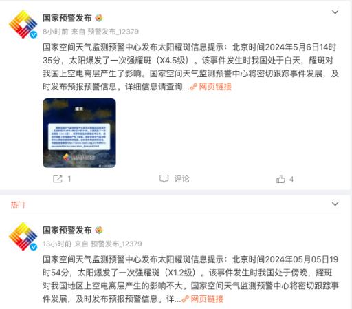 国度空间天气监测预警中心瞻望,现在直到5月8日,仍有可能爆发M级以致X级以上耀斑。国度空间天气监测预警中心暗示将密切追踪事件发展,实时发布预告预警信息。